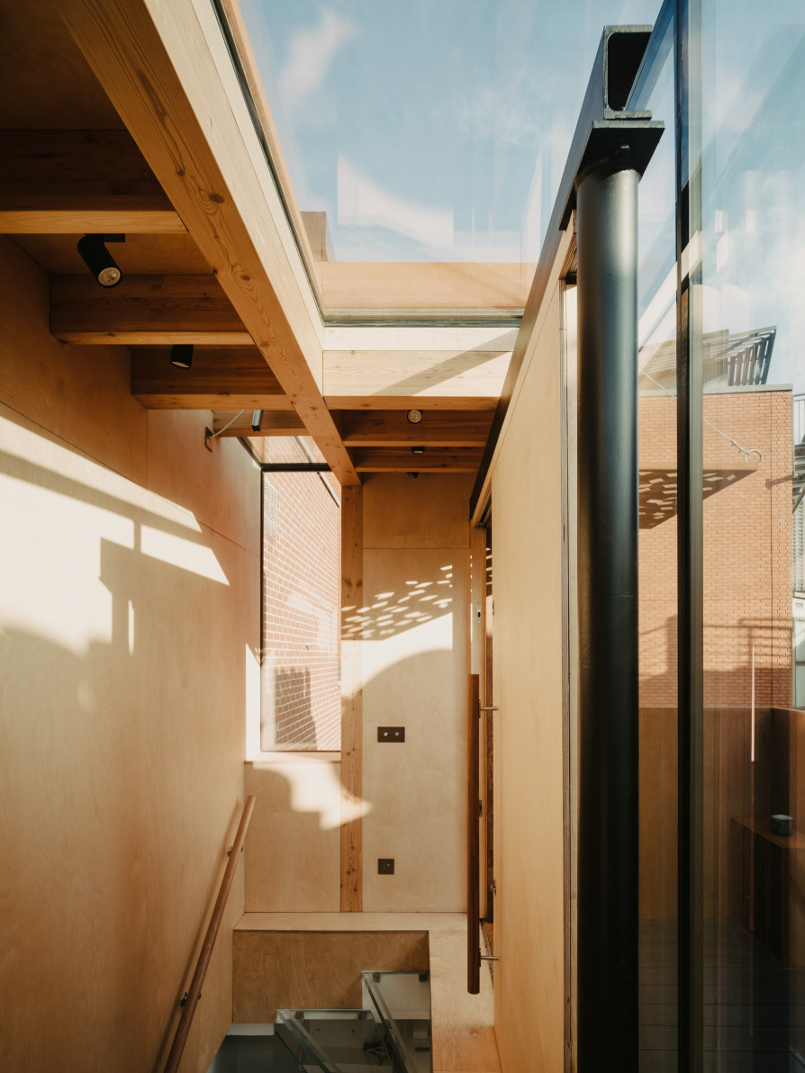 An innovative, sustainable and sculptural design for a stair enclosure. This development of an existing residence in a Victorian warehouse involved the complete remodelling of the roof terrace, with the installation of an exposed Siberian larch glulam structural frame, plywood, corten steel and glass panel enclosure.