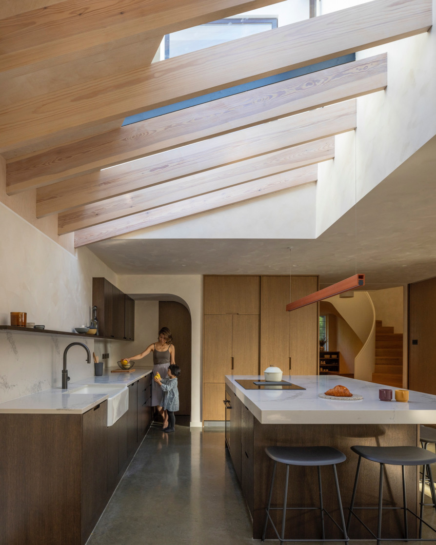 Aberdeen Park House, transformed by Neil Dusheiko Architects, reimagines an inter-war villa in Islington’s conservation area for a growing family. A new brick extension playfully references the adjacent Victorian warehouse form, incorporating a triangular rooflight sat on timber fins, floods the kitchen and living spaces with abundant natural light. A sculpted helical staircase connects the floors with a continuous handrail and turns the existing stained-glass side window into a major feature of the home. The open stairwell and rooflight also provide natural ventilation, ensuring a comfortable and airy atmosphere throughout the reconfigured interior.