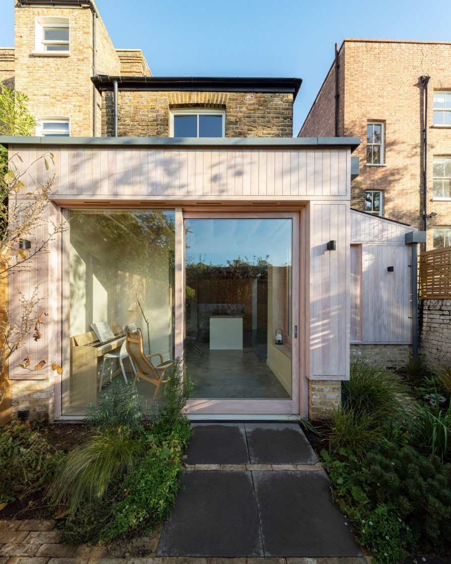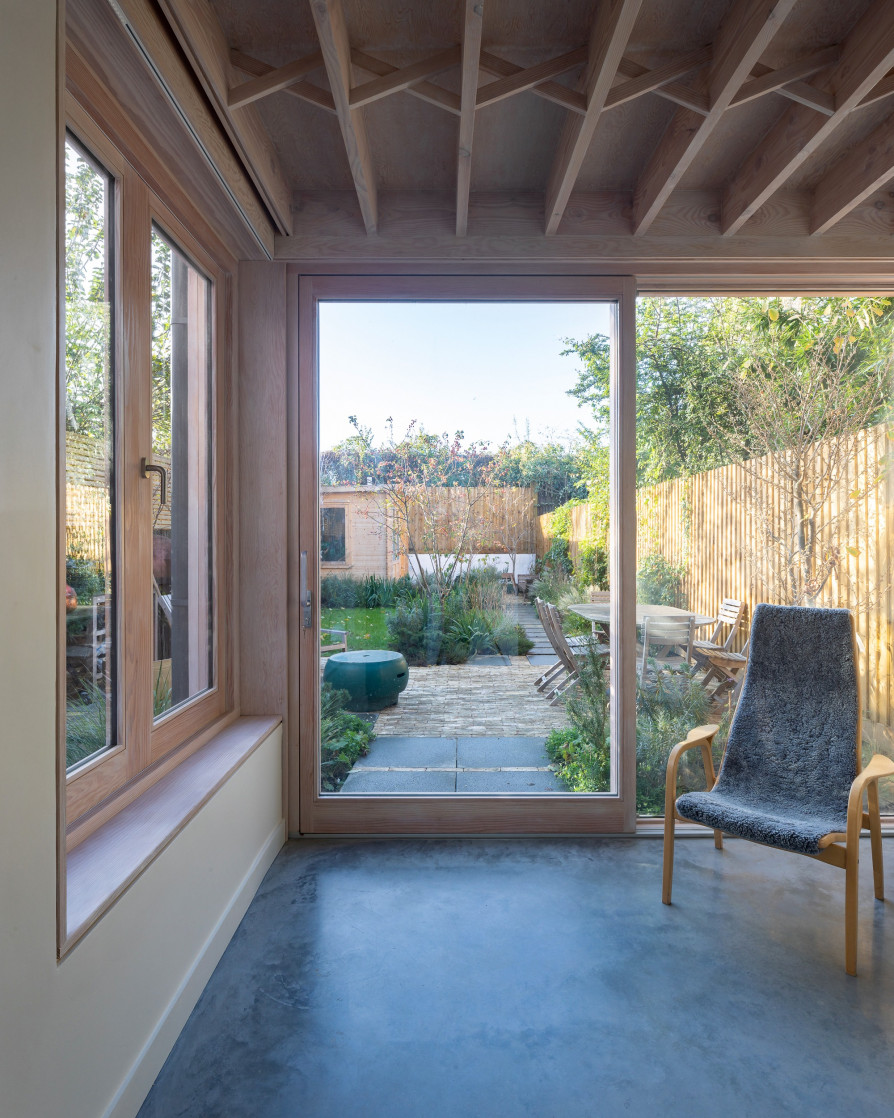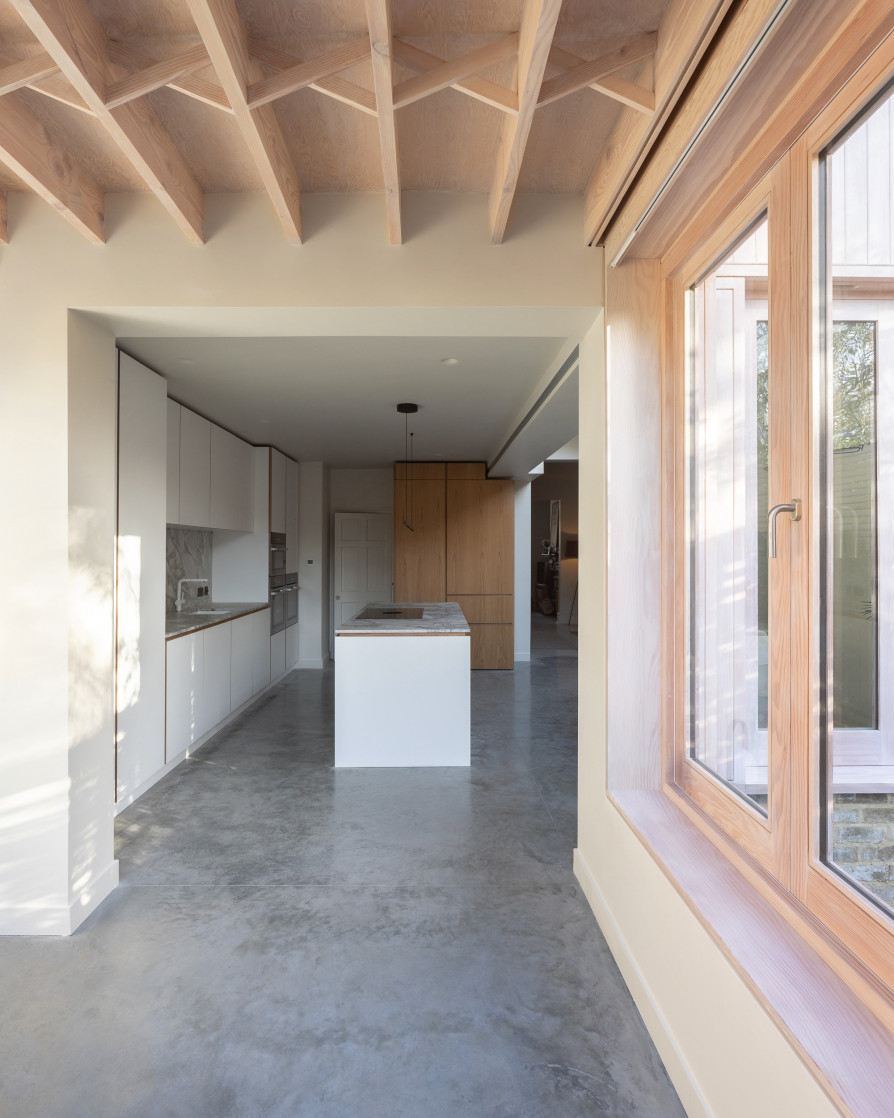 The new extension is articulated internally with an exposed Douglas fir structure with herringbone noggins providing a nod toward the structural techniques found within the floor structure of the original house.