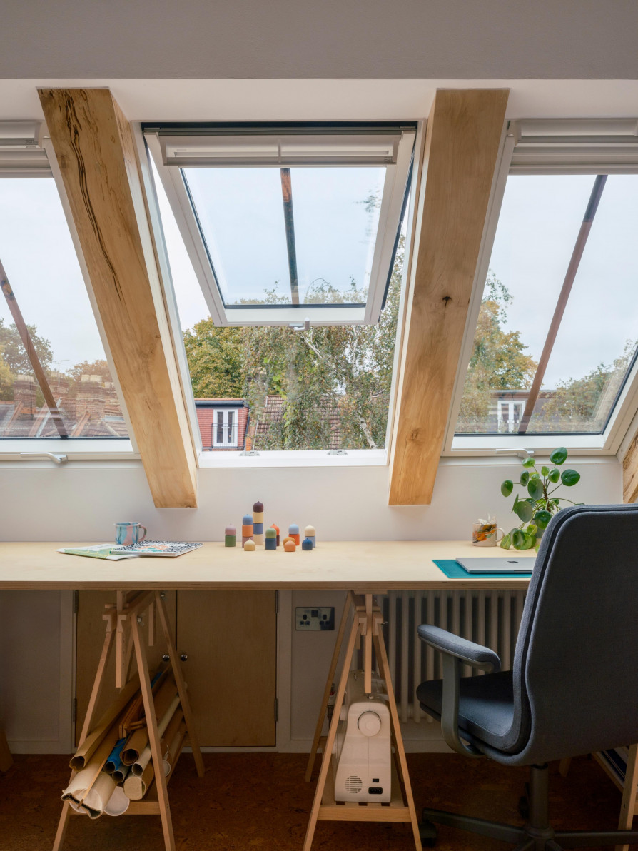 Treetop Office consists of a new loft room in a Warner House in Walthamstow, with a staircase and new joinery made from old trees. The mixed species palette of London Plane, Hornbeam, Elm and Beech was supplied by Fallen and Felled, utilising timber from London’s street trees that would otherwise be destined for the chipper. The muted colours of the different tones of timber, including spalted pieces, combine together with cork flooring, lime-washed bricks, and a combination of lime-based paint and bare multi-finish plaster to create a calm office space for the residents, that looks over London’s treetops.
